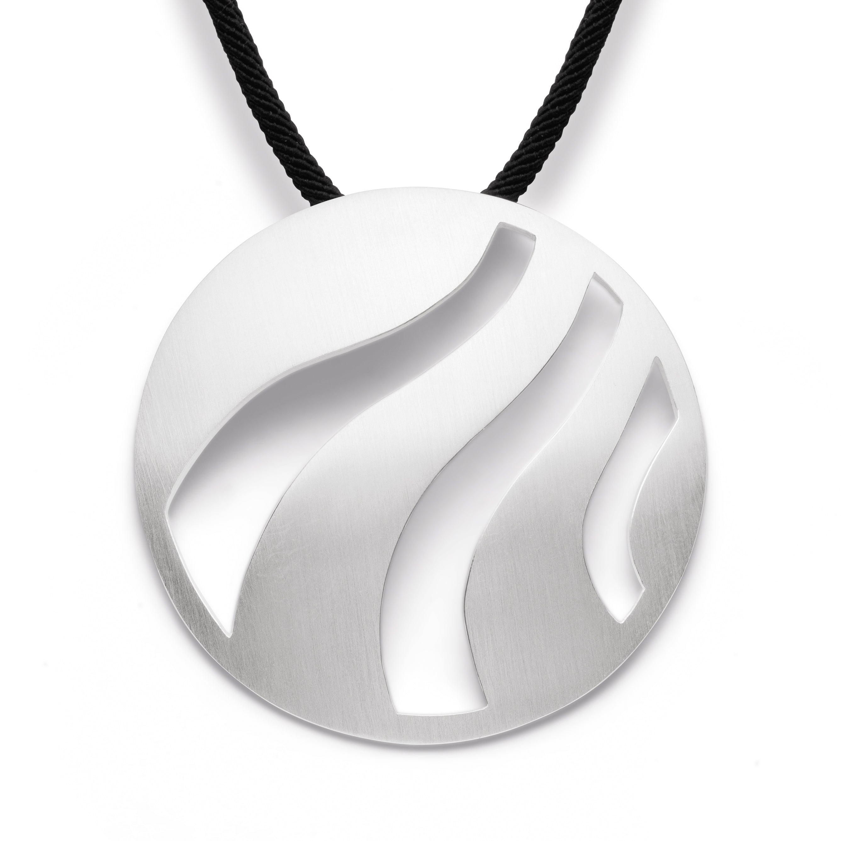 Nadine Resch heißt die Designerin, die diesen rund geformten und leicht gewölbten Anhänger mit versteckter Aufhängung aus mattiertem 925/-Sterlingsilber konzipiert hat. Ein wunderschöner und zugleich markanter Begleiter für beinahe jeden Anlass. Auch die hier erkennbare wertvoll-massive Verarbeitung zieht sich wie ein roter Faden durch diese spezielle Design-Linie von bastian inverun. Ein charakterstarkes Schmuckstück, welches mit schwungvoll-dynamisch verlaufenden Cut-Outs die Blicke auf sich zieht.