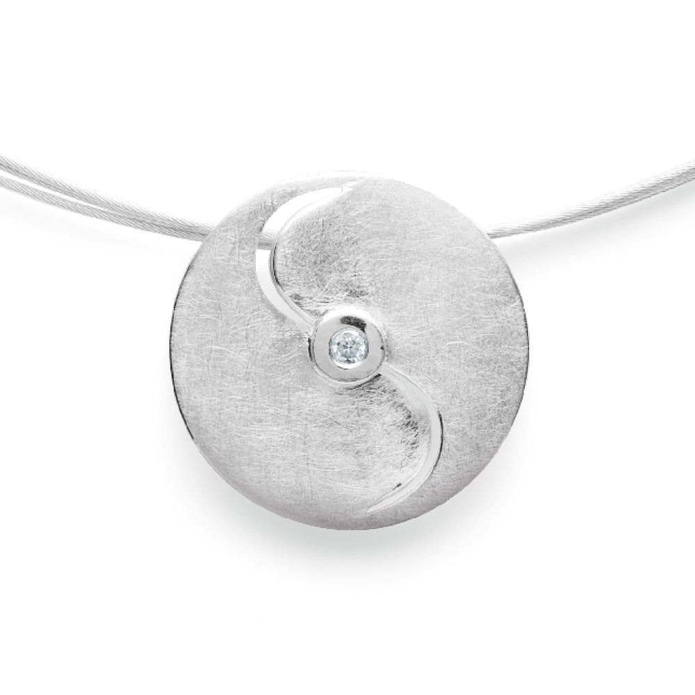 Dieser zierliche Scheiben-Anhänger aus kratzmattiertem 925/-Sterlingsilber wird durch den mittig positionierten und durch geschwungene Cut-Outs hervorgehobenen Brillanten mit 0,03ct zu einem zeitlosen Hingucker-Schmuckstück für die Ewigkeit.