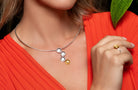 Vier aneinander gereihte, schalenförmige Schmuckelemente, die durch einen funkelnden Brillanten (0,02ct) sowie die bicolore Farbgebung gekrönt werden, ergeben diesen zeitlosen und modernen, länglich gehaltenen Anhänger (Design by Nadine Resch). Perfekt in Ergänzung mit den passenden Ohrsteckern und passendem Ring.