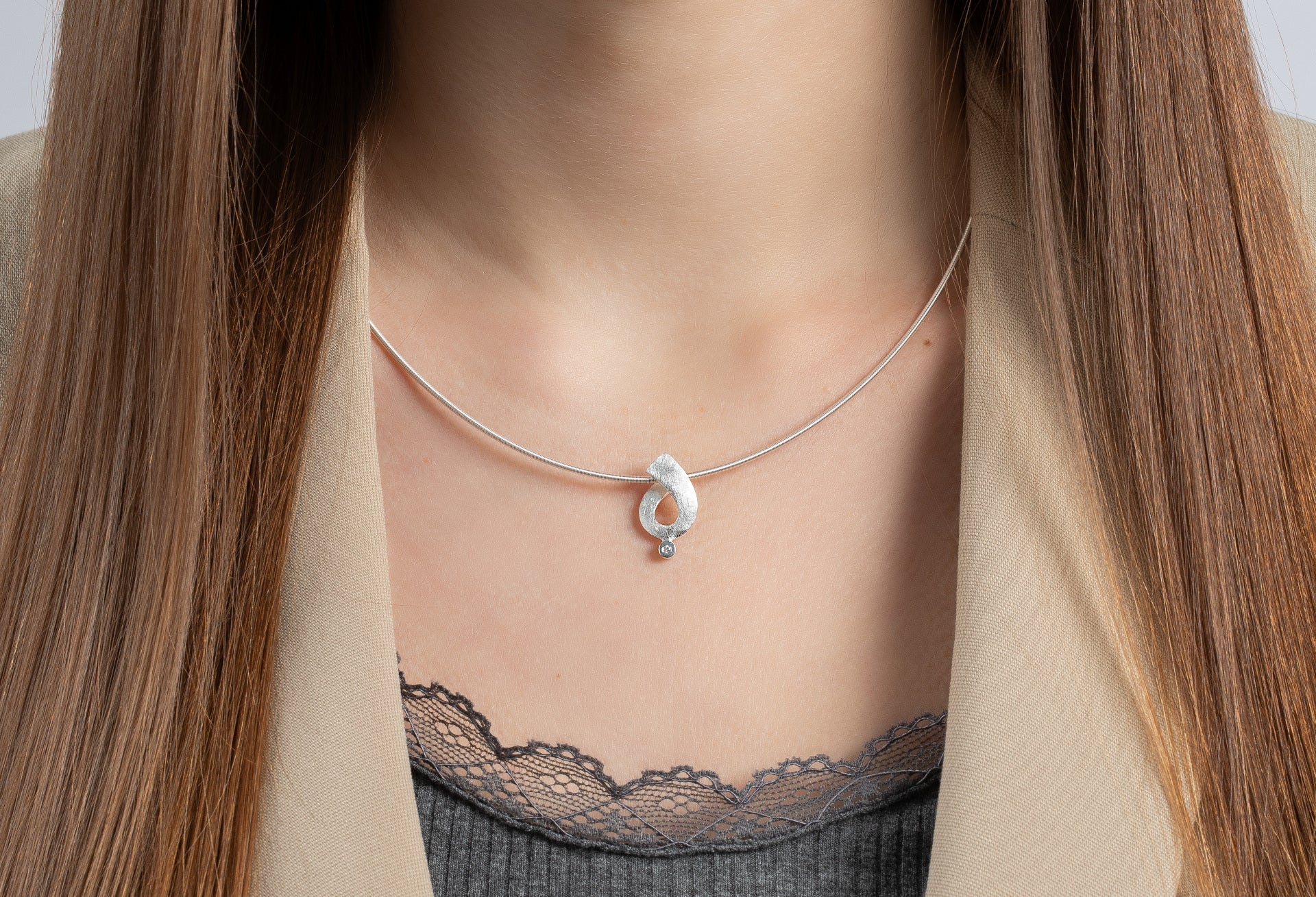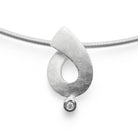 Sinnlich und leicht eingedrehter Anhänger aus kratzmattiertem 925/- Sterlingsilber. Dieser zauberhafte Halsschmuck aus der Feder der Düsseldorfer Designerin Nadine Resch besticht durch einen funkelnden Brillant mit 0,02ct und eine dynamische Formgebung. Die versteckte Aufhängung sorgt für die besonders elegante Ausstrahlung dieses attraktiven Halsschmucks. Ein wertvoll verarbeitetes Schmuckstück mit dem Zeug zum absoluten Lieblingsschmuckstück.