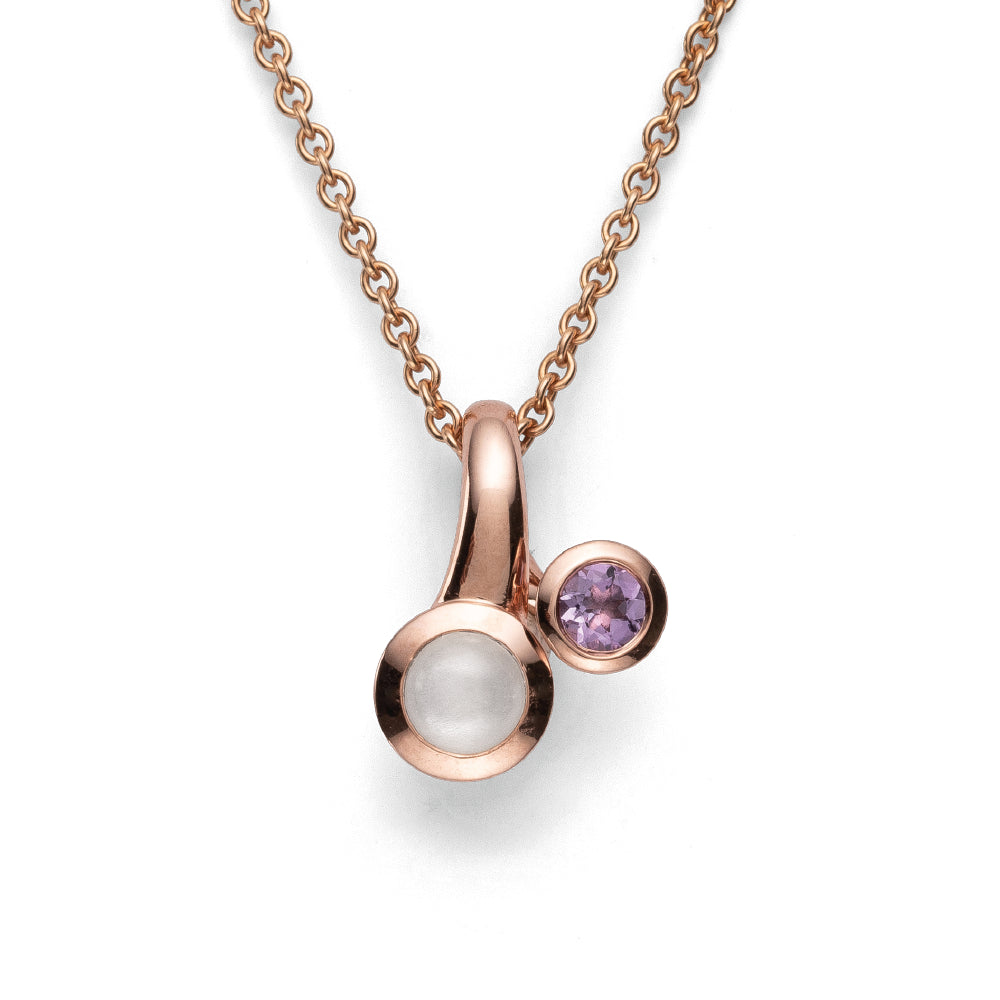 Rosévergoldetes poliertes 925/- Sterlingsilber trifft auf einen funkelnden Amethysten (0,15ct) und einen weißen Mondstein (0,43ct). Die besondere Farbgebung sowie die filigrane Formgebung lassen den in feinster Handarbeit gefertigten Anhänger zum besonderen Hingucker werden. Mit viel Liebe zum Detail und dem Gespür für die kleinen, besonderen Merkmale wurde dieses Designschmuckstück von der deutschen Designerin Nadine Resch kreiert. Mit dazugehörigen Ohrsteckern und passendem Ring erhältlich.