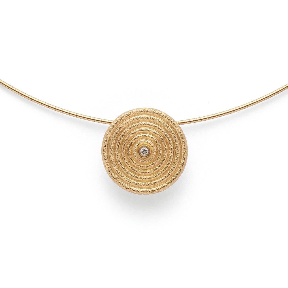 "The Round 'n' Round Collection" - eine geometrisch inspirierte Designlinie in charakterstarker Ringoptik aus der Feder des Designers Thomas Mayer. Mattiertes und gebürstetes 750/- Gelbgold wird durch einen funkelnden und zum Brillant geschliffenen Diamanten mit 0,02ct (W-SI) gekrönt. Mit passenden Ohrsteckern sowie auch in vergoldetem 925/- Sterlingsilber erhältlich.