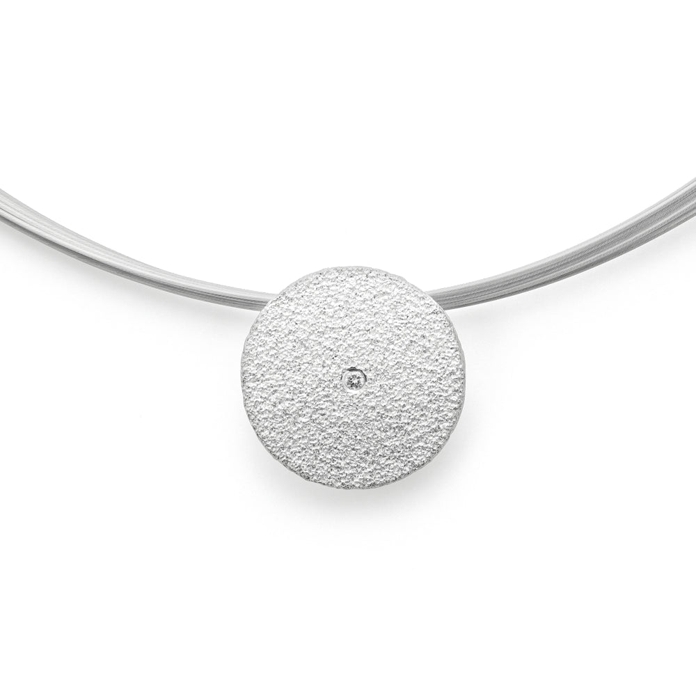 Dieser Anhänger aus 925/- Sterlingsilber besticht durch eine von Hand bearbeitete mattierte, gebürstete Oberflächenstruktur und einen funkelnden Brillanten mit 0,02ct. Ein besonderes Schmuckstück das sich vielseitig kombinieren lässt und durch die hochwertige Verarbeitung sowie einen durchweg handwerklichen Charakter großen Anklang findet. Perfekt in Kombination mit den passenden Ohrsteckern und passendem Ring.