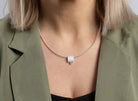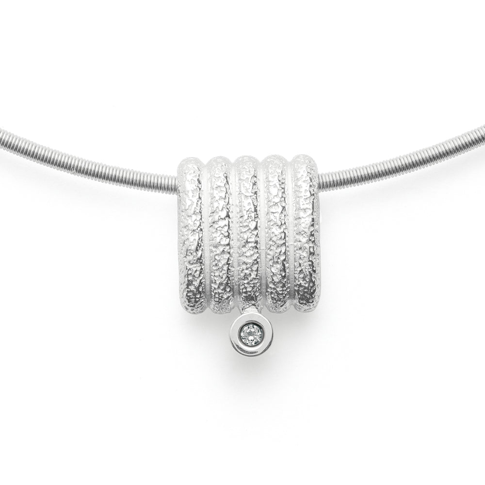 Dieser doppellagig gearbeitete Anhänger aus 925/- Sterlingsilber besticht durch eine von Hand bearbeitete mattierte, gebürstete Oberflächenstruktur und einen funkelnden weißen Topas mit 0,02ct. Ein besonderes Schmuckstück das sich vielseitig kombinieren lässt und durch die hochwertige Verarbeitung sowie einen durchweg handwerklichen Charakter großen Anklang findet.