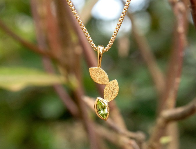 Ein zauberhaft vergoldeter Anhänger aus kratzmattiertem und poliertem 925/- Sterlingsilber beeindruckt durch eine floral inspirierte Formgebung. Der in feinster Handarbeit gefertigte Designanhänger wird durch den funkelnden Peridot mit 0,58ct zu einem besonderen Hingucker. Ein attraktives Design aus der Feder der Düsseldorfer Designerin Nadine Resch. Perfekt in Kombination mit den passenden Ohrsteckern.
