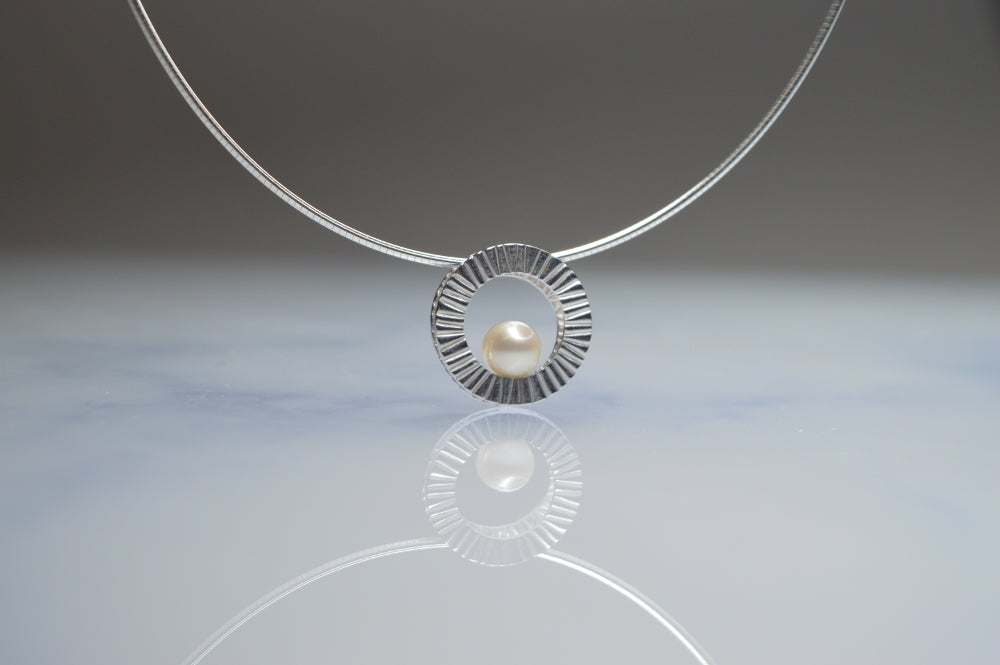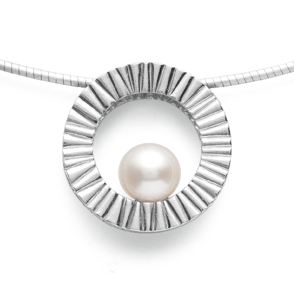 Zeitlos-eleganter, runder Perlanhänger aus rhodiniertem (anlaufgeschütztem) 925/-Sterlingsilber mit einprägsamer Obertflächengestaltung. Die mittig arrangierte Süßwasserzuchtperle ist das schimmernde Highlight dieser Designkreation der deutschen Designerin Nadine Resch.