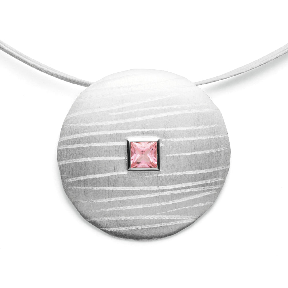 Dieser charakteristische, aus mattiertem und gebürsteten 925/- Sterlingsilber gefertigte Scheiben-Anhänger sticht aufgrund zweierlei raffinierter Merkmale hervor. Die individuelle Oberflächengestaltung des Anhängers (Design by Dietmar Sebastian) trifft auf einen mittig positionierten, spezialgeschliffenen Pink Topas mit 0,70ct, der durch die polierte und quadratische Fassung im besonderen Maße hervorgehoben wird. Ein zauberhaftes Schmuckstück, welches sowohl sportlich als auch elegant kombiniert werden kann.
