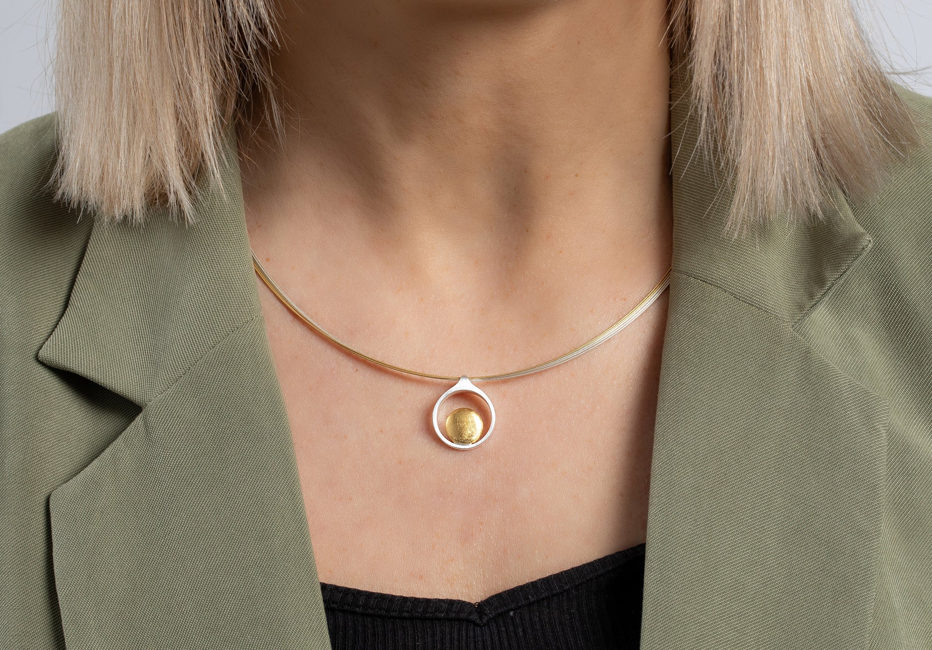 Dieser stilvolle Anhänger aus mattiertem und kratzmattiertem 925/- Sterlingsilber überzeugt in einem bicoloren Design und einer zeitlos-eleganten Formgebung. Das kreisrund und leicht nach außen gewölbte vergoldete Schmuckelement wird zu einem besonderen Highlight des Schmuckstücks. Kreiert von der Designerin Catherine Niegel. Perfekt in Kombination mit den passenden Ohrhängern und dem passenden Ring erhältlich.