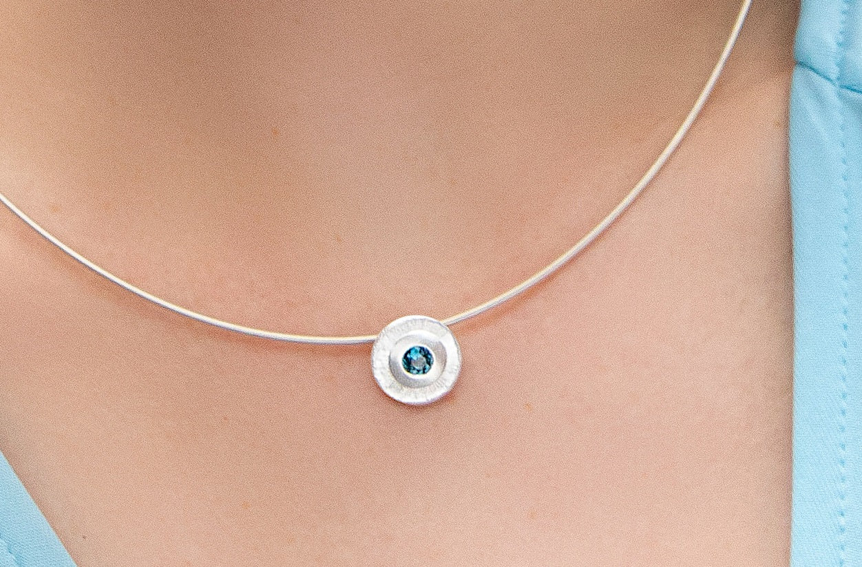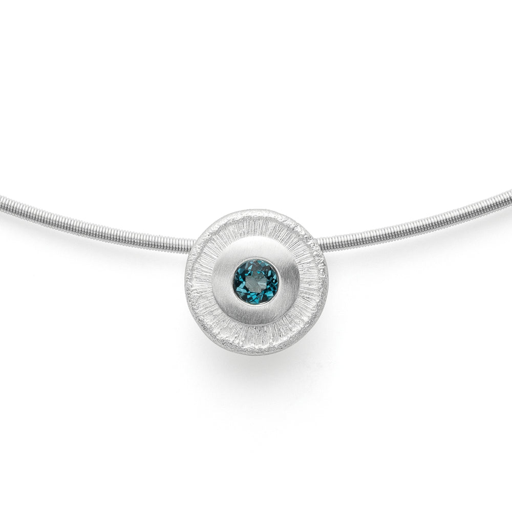 Eine durchweg charakteristische Oberflächenstruktur trifft auf einen funkelnden und mittig positionierten Blautopas mit 0,14ct. Designt wurde dieses eindrucksvolle Designschmuckstück aus 925/- Sterlingsilber von dem Goldschmiedemeister Thomas Mayer.