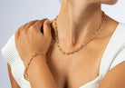 Zeitlos-elegantes Armband mit polierter Oberfläche aus der Kollektion "River Flow". Ein Meisterwerk aus vielzähligen, unterschiedlich geformten und fein versäuberten Elementen aus gelbgoldvergoldetem 925/-Sterlingsilber und einer Länge von 19cm mit 3cm Verlängerungsoption. Jedes oval Glied, mal klein mal groß, ist kunstvoll miteinander verbunden, um eine insgesamt dynamische und geschmeidige Struktur zu schaffen.Das flexible Armband fängt jede Bewegung seiner Trägerin ein und unterstreicht die jeweilige Körperformen optimal. Perfekt in Kombination mit dem dazugehörigen Collier.