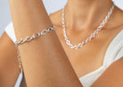 Zeitlos-elegantes Silber-Armband mit mattierter Oberfläche aus der Kollektion "River Flow". Ein Meisterwerk aus vielzähligen, unterschiedlich geformten und fein versäuberten Elementen aus wertigem 925/-Sterlingsilber und einer Länge von 19cm mit 3cm Verlängerungsoption. Jedes oval Glied, mal klein mal groß, ist kunstvoll miteinander verbunden, um eine insgesamt dynamische und geschmeidige Struktur zu schaffen. Das flexible Armband fängt jede Bewegung seiner Trägerin ein und unterstreicht die jeweilige Körperformen optimal. Perfekt in Kombination mit dem dazugehörigen Collier.