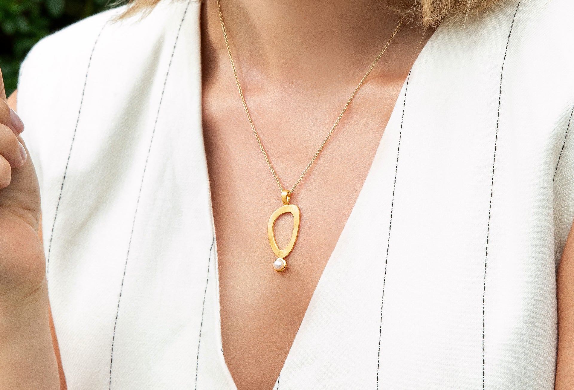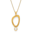 Dieser zauberhafte Anhänger aus vergoldetem 925/- Sterlingsilber besticht durch eine mittig platzierte weiße Zuchtperle (0,77ct) sowie die asymmetrische Formgebung. Ein wertvoll verarbeitetes Schmuckstück mit individueller Oberflächengestaltung aus der Feder der Designerin Nadine Resch mit dem Zeug zum absoluten Lieblingsschmuckstück. Erhältlich mit passenden Ohrhängern.
