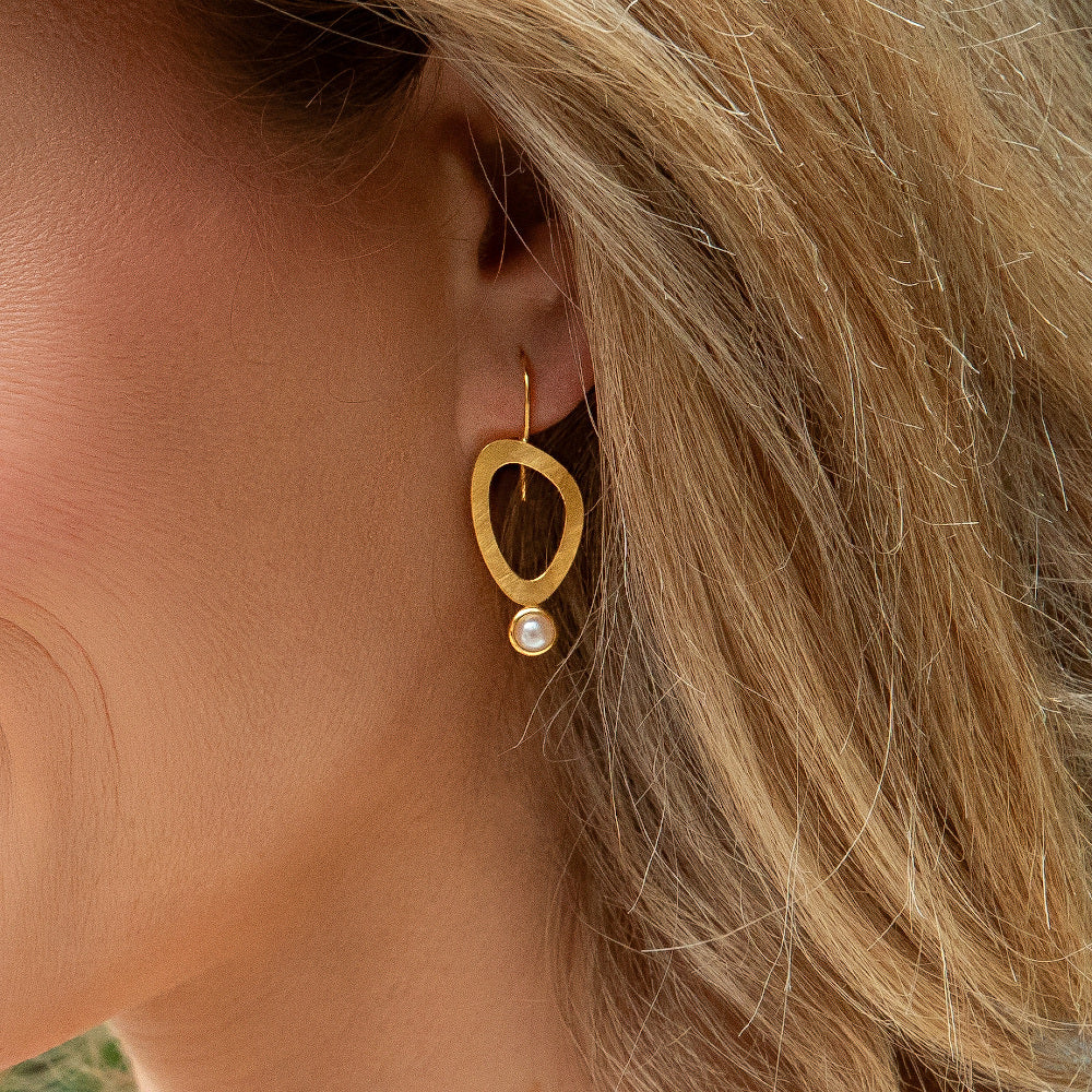 Diese zauberhaften Ohrhänger aus vergoldetem 925/- Sterlingsilber bestechen durch eine mittig platzierte weiße Zuchtperle (0,95ct) sowie die asymmetrische Formgebung. Ein wertvoll verarbeitetes Schmuckstück mit individueller Oberflächengestaltung aus der Feder der Designerin Nadine Resch mit dem Zeug zum absoluten Lieblingsschmuckstück. Erhältlich mit passenden Ohrhängern.