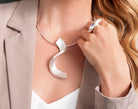 Opulenter Statement-Anhänger aus der Design-Linie "Magic Twist". Strahlendes 925/- Sterlingsilber mit strichmattierter Oberfläche formt sich zu einem wunderschön geschwungenen Halsschmuck in außergewöhnlicher Qualität. Perfekt kombiniert mit den dazugehörigen Ohrsteckern oder dem dazugehörigen Ring. Ein zeitloses und zugleich elegantes Designschmuckstück aus der Feder der talentierten Designerin Dr. Sabine Brandenburg-Frank. Die vertikale Ausrichtung betont den Ausschnitt optimal. Wir empfehlen für diesen Anhänger einen etwas breiteren Halreif, zum Beispiel Modell Nr. 27030.