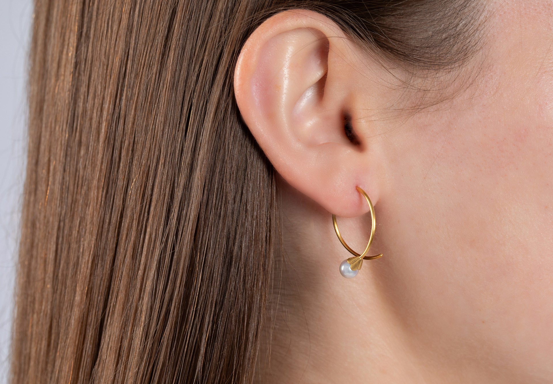 Ein sinnlich geformter Ohrschmuck aus vergoldetem 925/- Sterlingsilber mit mattierter Oberfläche trifft auf weiße Zuchtperlen mit 2,30 Karat. Die eleganten Ohrhänger begeistern durch eine einzigartige Formgebung mit floralen Details, die die Zuchtperlen leicht umfassen. Ob für den Alltagslook oder für einen besonderen Anlass - dieser Designschmuck verleiht jedem einen stilvollen und zugleich femininen Ausdruck!