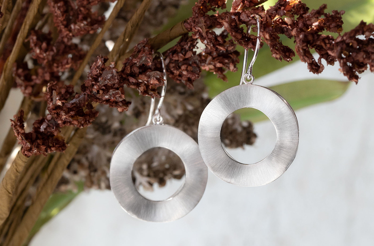 Kreisrunde Ohrhänger aus strichmattiertem 925/- Sterlingsilber treffen auf eine sinnlich-geschwungene, wellenartige Formgebung. Diese zauberhaften Designohrhänger aus der Feder der Düsseldorfer Designerin Nadine Resch zeigen sich zeitlos und elegant zugleich.