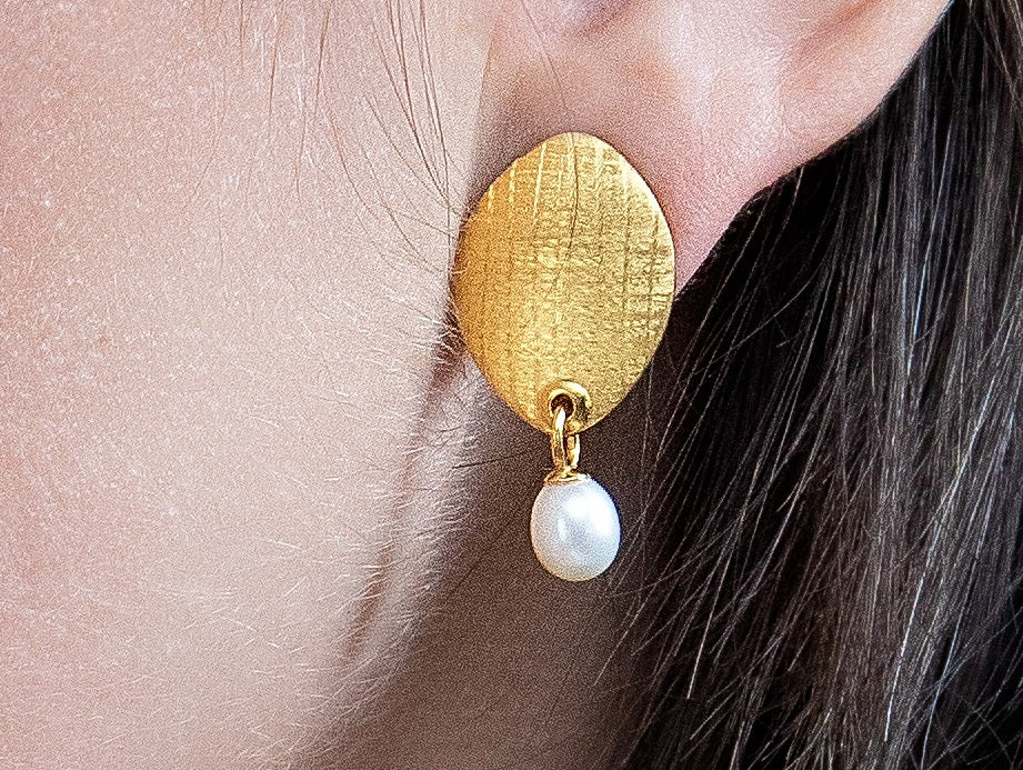 Organisch geformte und handwerklich verarbeitete Ohrstecker mit besonders gearbeiteter Schraffur-Oberfläche und eingehängten, tropfenförmigen weißen Süßwasserzuchtperlen (3,18ct). Ein designstarker Ohrschmuck aus der Feder des Osnabrücker Designers Dietmar Sebastian, gefertigt aus 18 Karat gelbvergoldetem 925/- Sterlingsilber in einer besonders attraktiven, warmen Farbe. Für den besonders bequemen Sitz am Ohr werden diese Designohrstecker mit großer Ohrmutter geliefert.