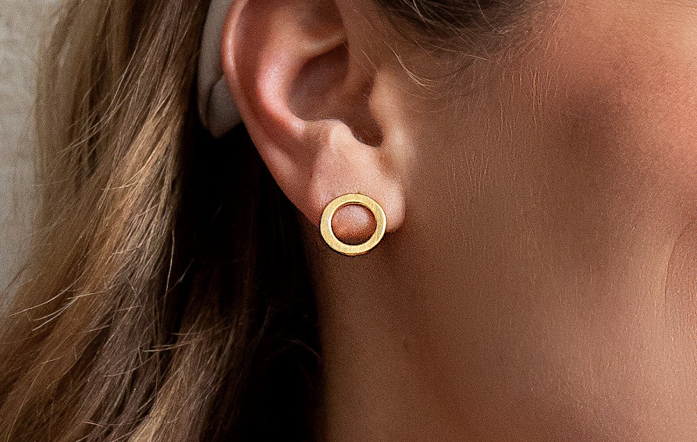 Kreisrund geformt zeigen sich diese modernen und doch zeitlos-eleganten Ohrstecker aus mattiertem und vergoldetem 925/- Sterlingsilber. Perfekt in Kombination mit dazugehörigen Diamant-Anhänger sowie passendem Armschmuck aus derselben Design-Reihe aus der Feder der Designerin Antje Liebscher.