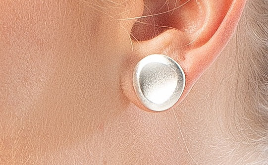 Diese Scheibenohrstecker aus 925/- Sterlingsilber überzeugen durch eine besondere sandmatte Oberflächengestaltung. Die nicht exakt kreisrund gearbeitete Ausführung sowie die leichte Wölbung nach innen hebt den besonders handwerklichen Charakter der Ohrstecker hervor. Für den besonders bequemen Sitz am Ohr wird dieser designstarke Ohrschmuck mit großer Ohrmutter geliefert.