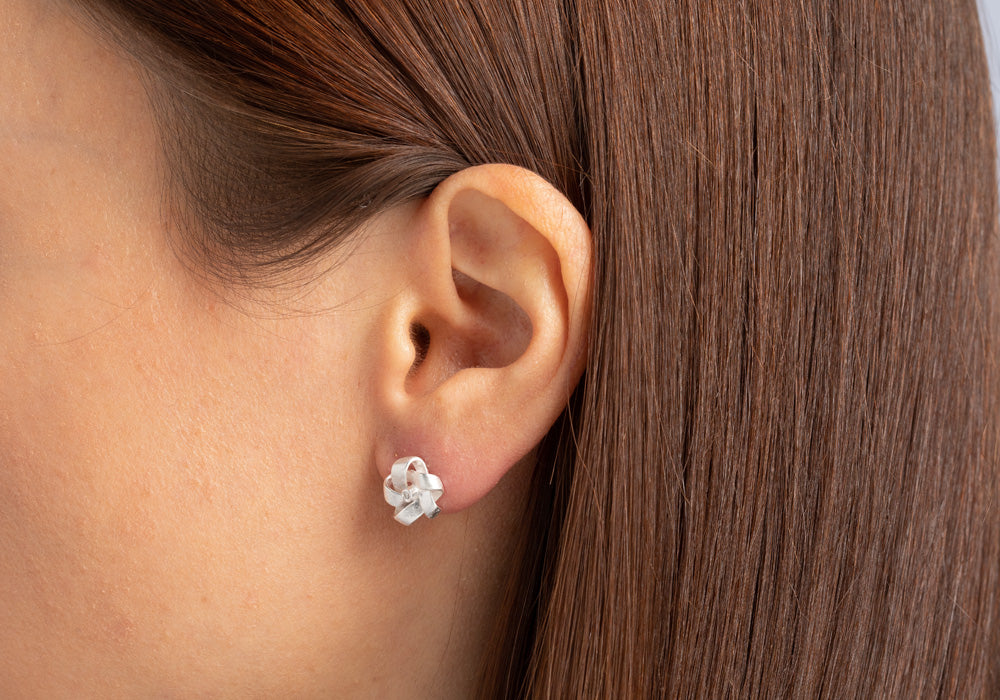 Feminin, filigran und einfach bezaubernd: Diese besonderen Ohrstecker aus kratzmattiertem 925/- Sterlingsilber überzeugen mit einer einzigartigen Formgebung und zentriert positionierten, funkelnden Brillanten (insgesamt 0,02ct, W-SI) in einer polierten Fassung.
