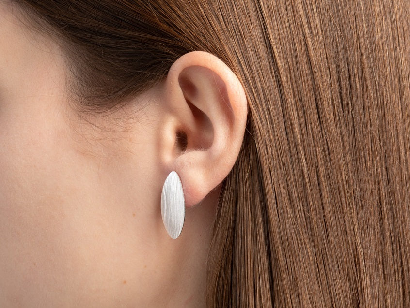 Navetteförmige große Ohrstecker mit besonders gearbeiteter Oberfläche. Trotz des schlicht gehaltenen, länglichen Designs wird dieser Ohrschmuck durch die besonders handwerkliche Ausstrahlung zu einem besonderen Schmuckhingucker, an dem man lange Freude haben wird. Für den besonders bequemen Sitz am Ohr werden diese Designohrstecker mit großer Ohrmutter geliefert. Perfekt in Kombination mit passendem Anhänger.