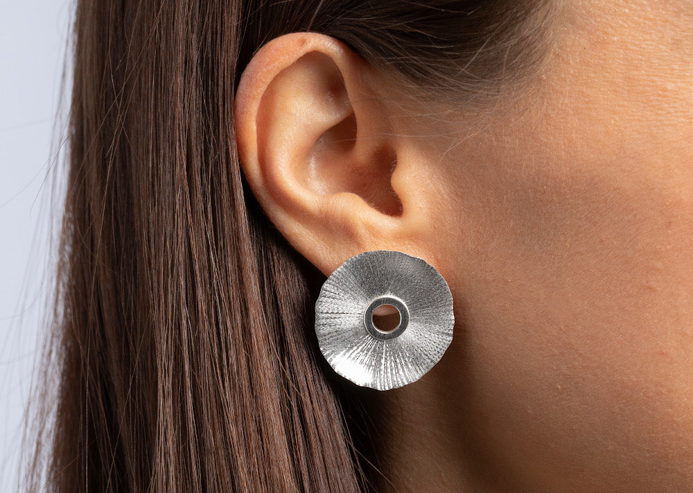 Geometrisch inspirierte Ohrstecker aus 925/- Sterlingsilber mit durchweg charakteristischer Oberflächengestaltung. Feine Linien werden von Hand mit Spezialbürsten in die Oberfläche eingearbeitet. Ein wahres Statement-Schmuckstück, welches insbesondere durch die handwerkliche Ausstrahlung zum besonderen Hingucker wird. Für den besonders hohen Tragekomfort werden diese Ohrstecker mit großer Ohrmutter geliefert. Mit passendem Anhänger verfügbar.