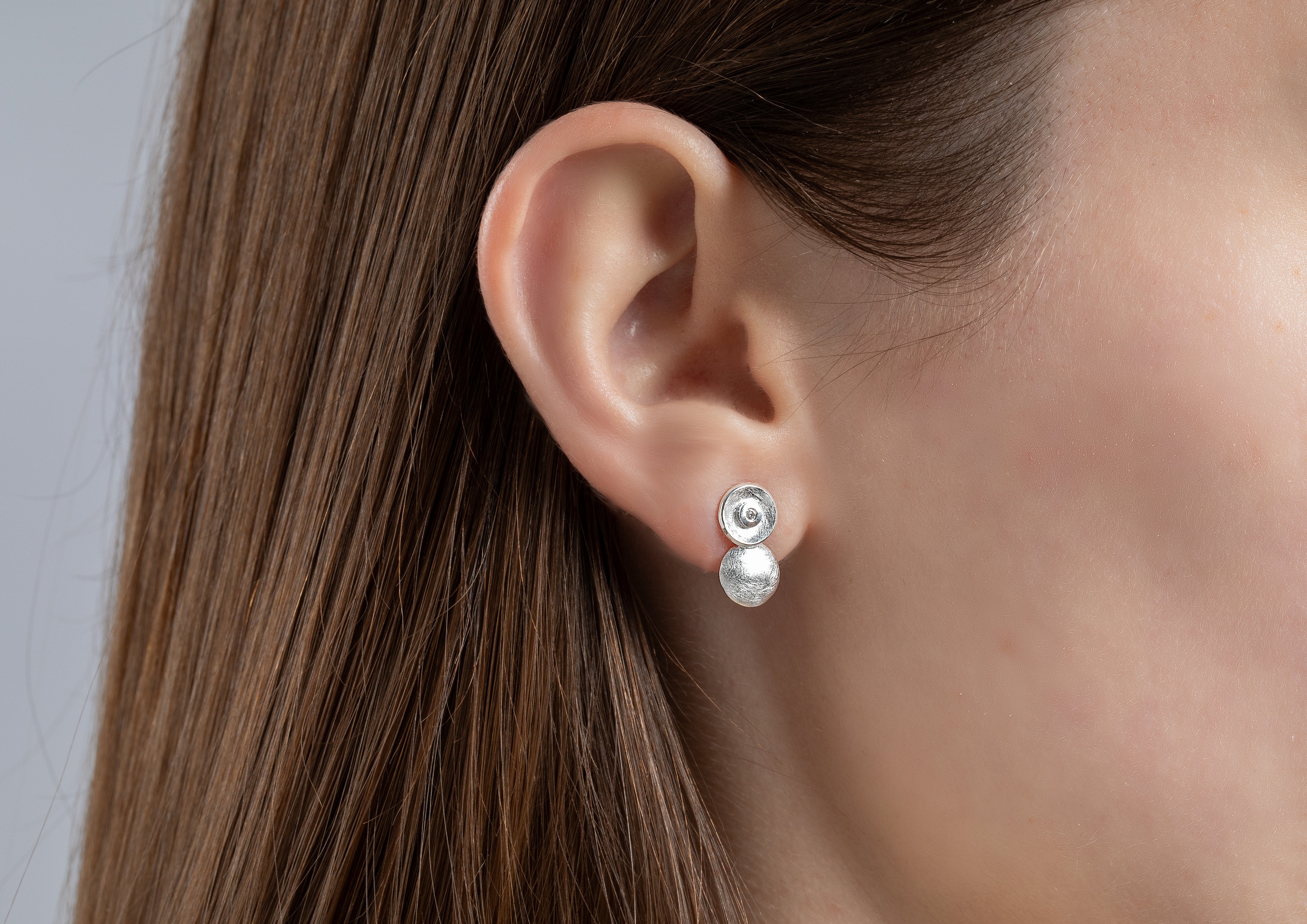 Zwei aneinandergereihte, schalenförmige Schmuckelemente, die durch einen funkelnden Brillanten (insgesamt 0,02ct) ergänzt werden, ergeben diese zeitlosen und doch modernen Ohrstecker (Design by Nadine Resch). Perfekt in Ergänzung mit passendem Anhänger und Ring.