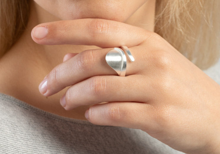 Mattiertes 925/- Sterlingsilber formt sich zu einem designstarken, offen gehaltenen Ring aus der Feder der Designerin und mehrfachen Red Dot Designaward-Gewinnerin Dr. Sabine Brandenburg-Frank.
