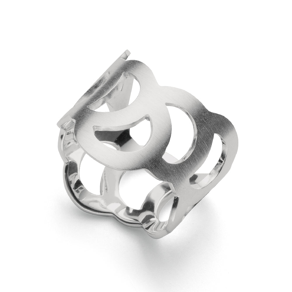 Strichmattiertes 925/- Sterlingsilber formt sich zu einem geometrisch inspiriertem Designring "Soap Bubbles" aus der Feder der deutschen Designerin Dr. Sabine Brandenburg-Frank.
