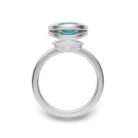 Ein auf den ersten Blick scheinbar klassisches Schmuckstück avanciert durch die Seitenansicht auf den Ringkopf zu einem echten Blickfang. Mattiertes 925/- Sterlingsilber umfasst einen spezialgeschliffenen Blautopas mit insgesamt 1,42 Karat. Der mehrschichtige Aufbau der Fassung setzt in der Seitenansicht den Blick auf den Körper des Edelsteins frei und lässt den Blautopas durch die optimale seitliche Lichtzufuhr in intensiven Blautönen schimmern und leuchten. Eine hervorstechende Designkreation der Düsseldorfer Designerin Nadine Resch.