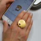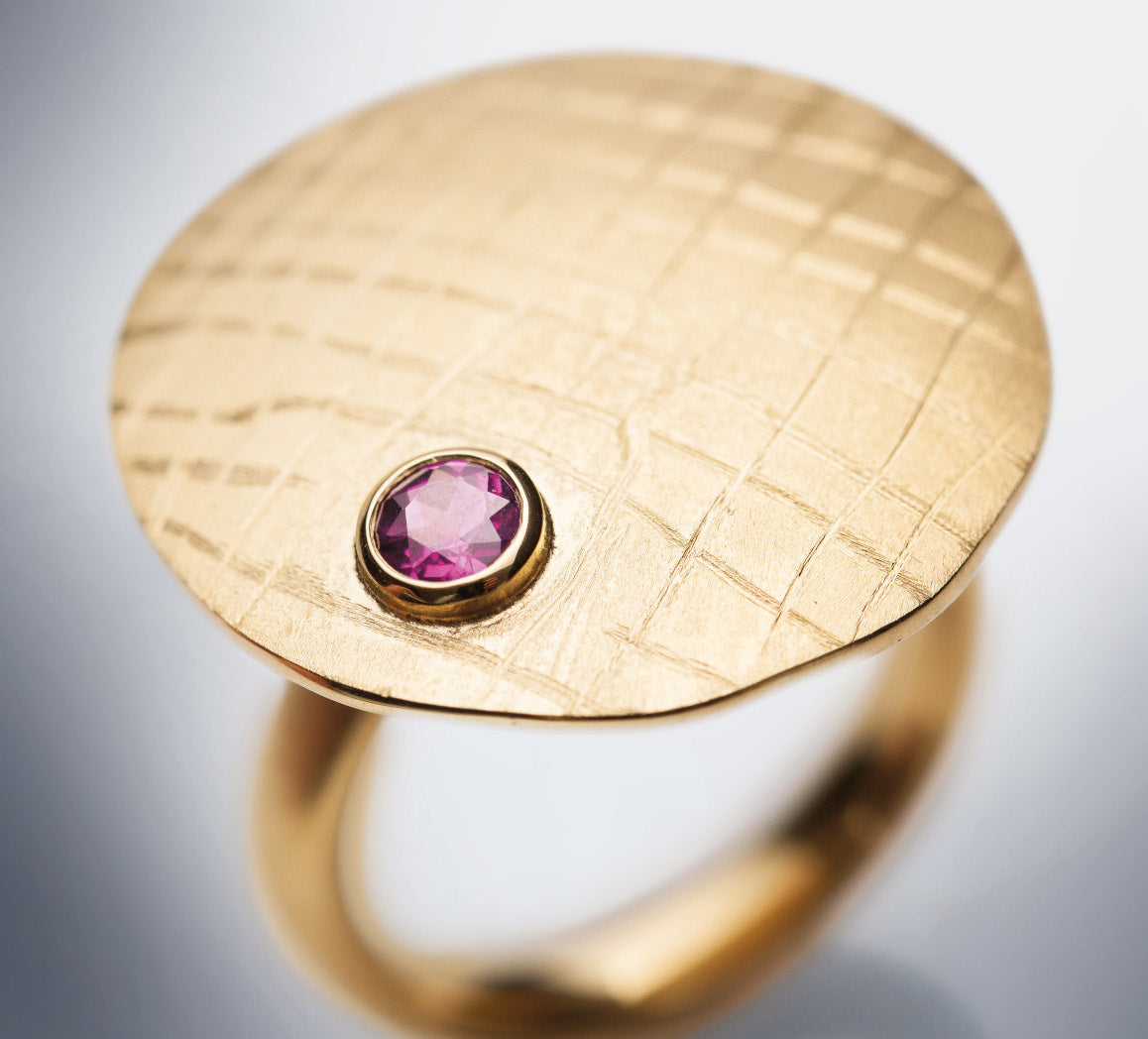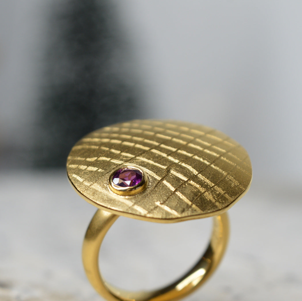 Stilvoller Ring mit einprägsamer Oberflächengestaltung und prachtvollem Rhodolithen: Dieses aus der Feder des deutschen Designers Dietmar Sebastian stammende Schmuckstück aus vergoldetem 925/-Sterlingsilber verzaubert durch eine einzigartige, organisch inspirierte Formgebung und eine charakteristische Oberflächengestaltung mit maximalem Wiedererkennungswert. Der pink/violett schillerne, farbstark daherkommende Rhodolith mit insgesamt 0,035ct unterstreicht die Ausstrahlung des romantischen Rings in perfekter Art und Weise.