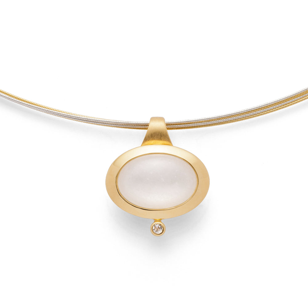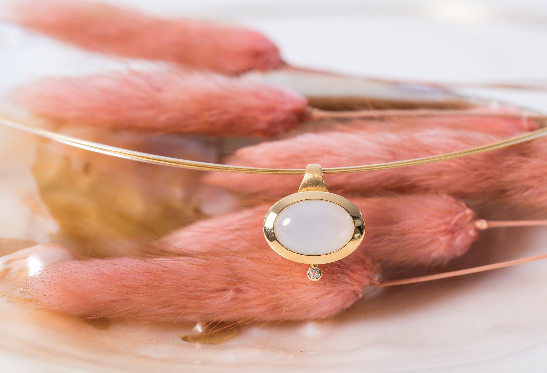 "Magic Moonlight Collection" – et tidløst elegant designervedhæng i forgyldt 925 sterlingsølv imponerer med sit høje kvalitetshåndværk. Den fortryllende hvide månesten (3,52 ct) kombineret med en hvid topas (0,02 ct) gør dette matte, men polerede vedhæng til et virkelig iøjnefaldende smykke. Med stor sans for detaljer og en skarp sans for små, særlige detaljer er dette vedhæng skabt af den tyske designer Nadine Resch. Det passer perfekt til den matchende ring og øreringe.