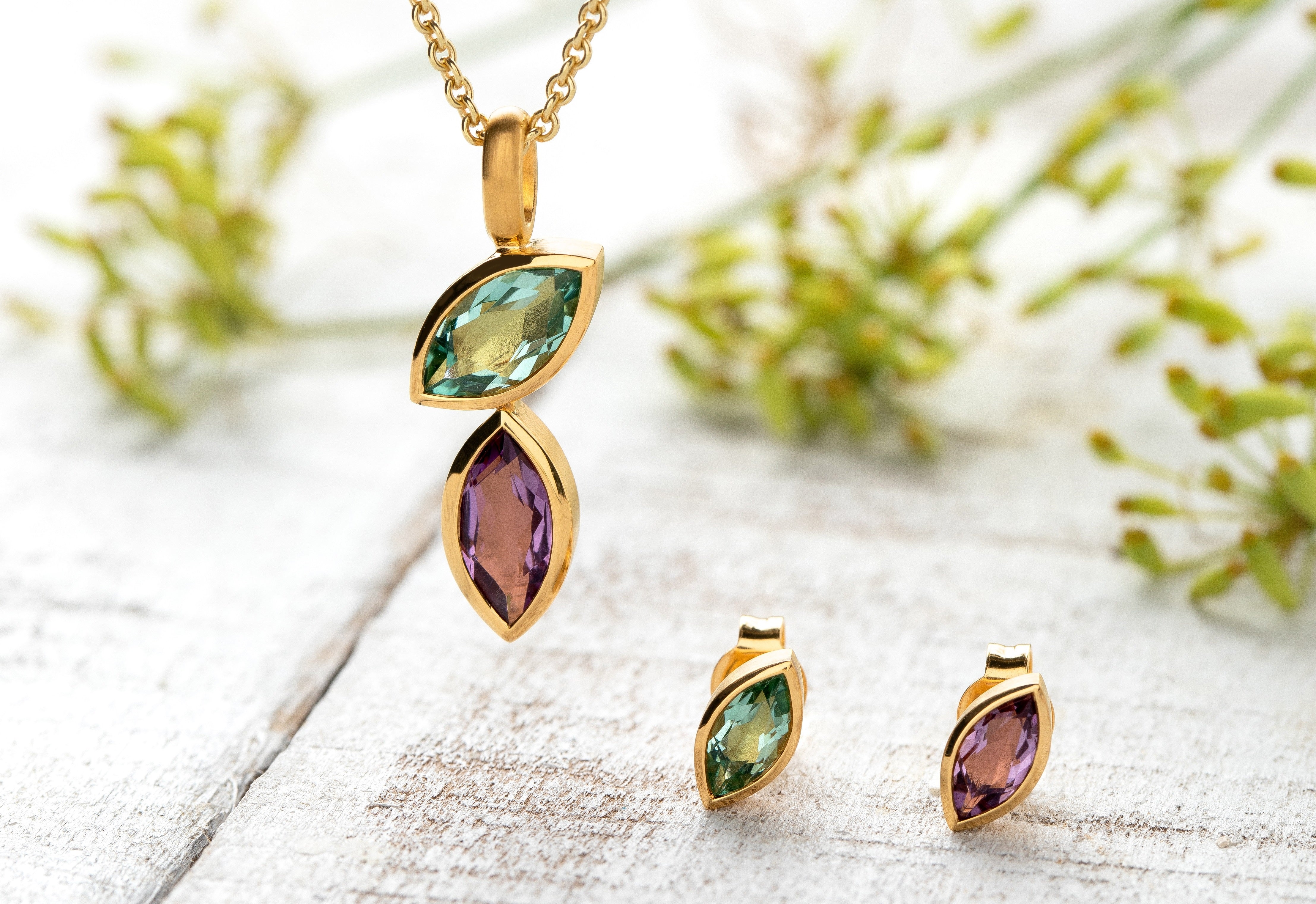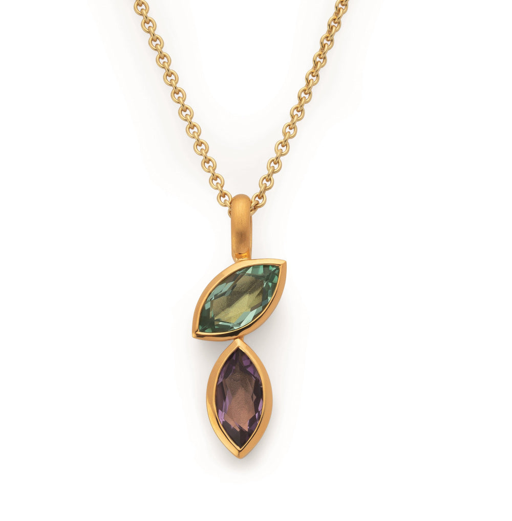 Ein attraktives Spiel aus Farbe und Positionierung: Zwei farbstarke Amethyste mit jeweils 0,8ct im Navette-Facettenschliff ergeben zusammengefügt diesen vertikal angeordneten Design-Anhänger "Navette Duo" aus 18 Karat vergoldetem Sterlingsilber, der durch die vertikale Ausführung den Ausschnitt seiner Trägerin gekonnt in Szene setzt. Die Polierung der Fassungen setzt die farbstarke Strahlkraft der Edelsteine besonders in Szene. Perfekt in Kombination mit den dazugehörigen Ohrsteckern, jeweils mit grünem und lilanem Amethyst erhältlich, je nachdem welche Farbe man verstärkt betonen möchte. Wir empfehlen für diesen Anhänger eine Kette, zum Beispiel die vergoldete Rundankerkette 26900.