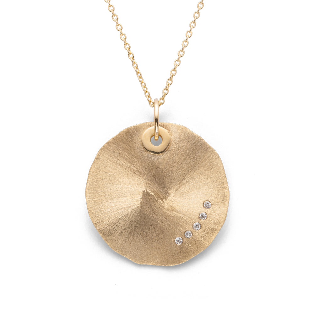 Et magisk designervedhæng i mat og børstet 18 karat guld har en håndlavet overfladetekstur, der udstråler på en unik måde afhængigt af lyset. Det elegante design og de funklende diamanter (0,05 ct) giver dette smykke en unik karisma. Perfekt kombineret med de matchende øreringe og ring. Fås eksklusivt hos specialforhandlere.