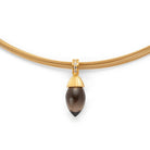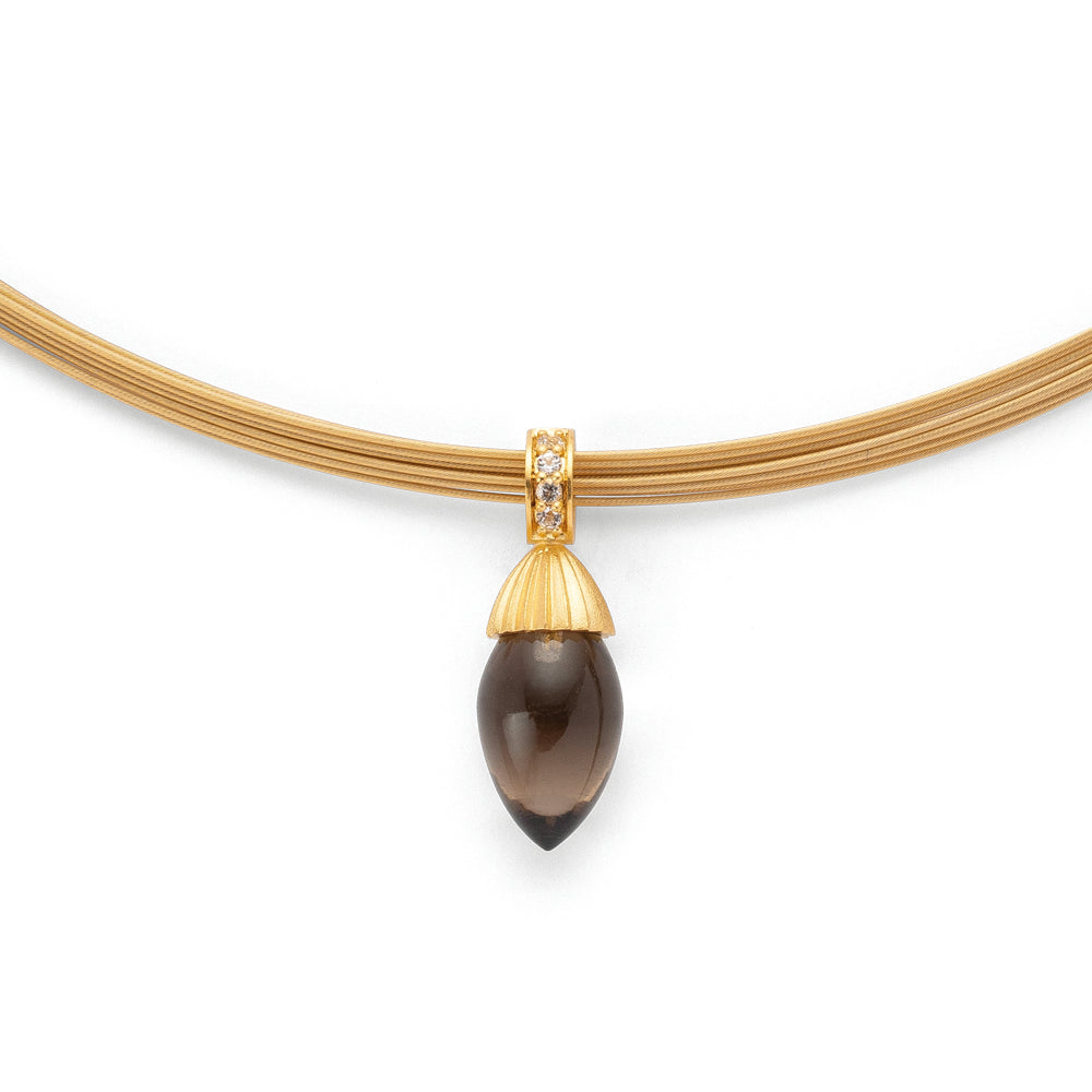Et charmerende designervedhæng i forgyldt, men sandmat 925 sterlingsølv har en dråbeformet røgkvarts (5,63 ct) og fire hvide topaser på i alt 0,06 ct. Den karakteristiske form og topasernes placering i vedhængets ophæng gør dette håndlavede vedhæng til et slående blikfang. Perfekt kombineret med de matchende øreringe.