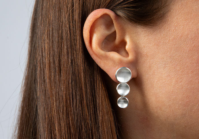Disse tidløse, men moderne designer-ørestikker i 925 sterlingsølv har tre forede, skålformede elementer med mat finish. Den polerede overfladefinish på bagsiden og yderkanten giver smykkerne et særligt elegant udseende. De bevægelige led sikrer en let og behagelig pasform. Perfekt i kombination med det matchende vedhæng.
