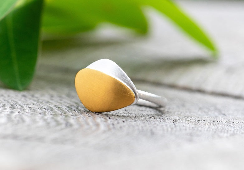 Denne stilfulde ring i 925 sterlingsølv har to stablede elementer i et tofarvet design, inspireret af naturen. Dens tidløst elegante form giver designerringen et slående, men moderne look. Dette fortryllende smykke er perfekt kombineret med matchende vedhæng, øreringe eller hængende øreringe.