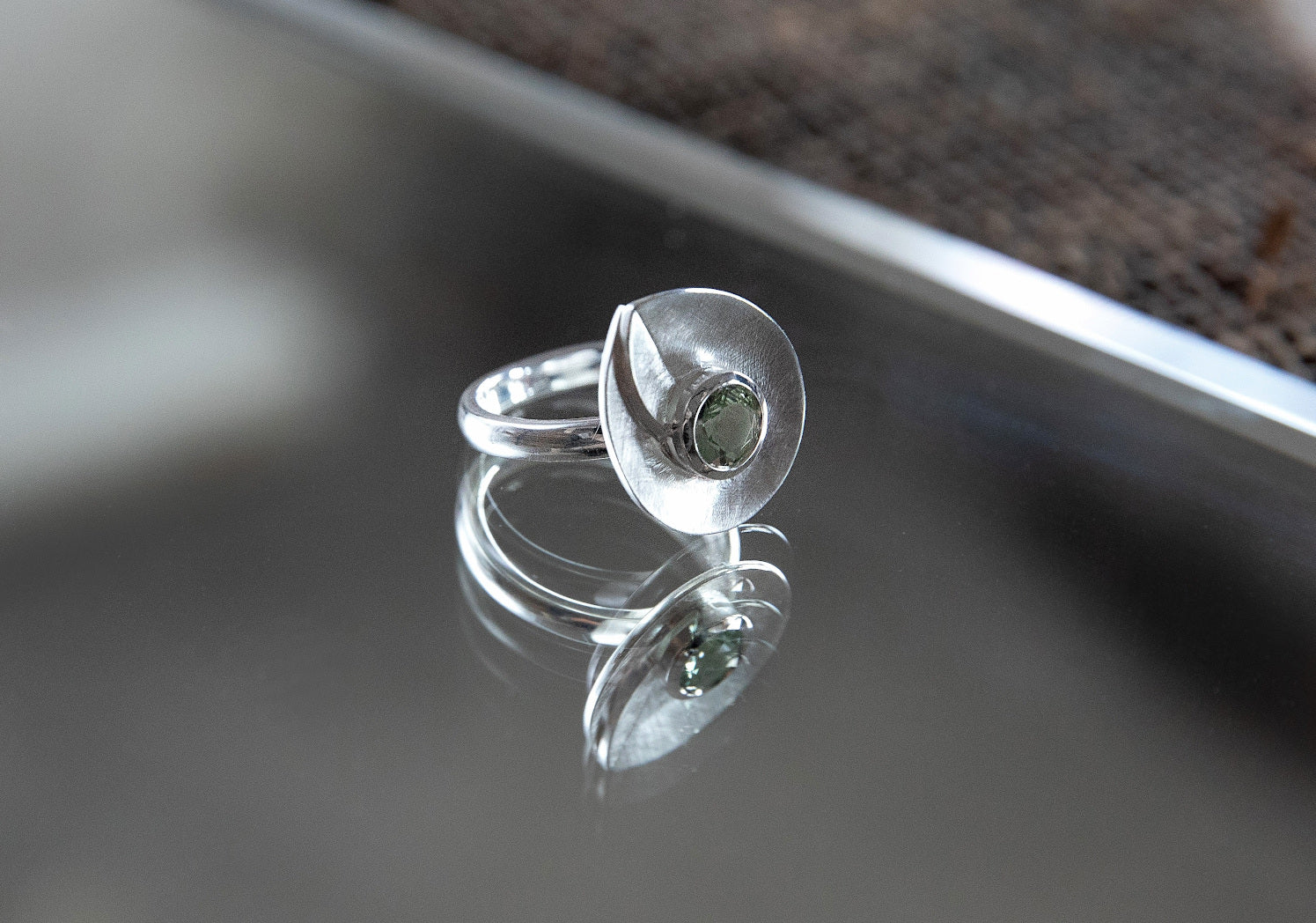 En bladformet ædelstensring lavet af ridsemat 925 sterlingsølv med en rund, standardslebet grøn ametyst (0,65 ct) i poleret fatning. Samspillet mellem varierende overfladeteksturer gør denne håndlavede ring med en poleret ringbånd, designet af den Düsseldorf-baserede designer Nadine Resch, til et yndlingssmykke. Perfekt sammen med matchende øreringe og et matchende vedhæng.