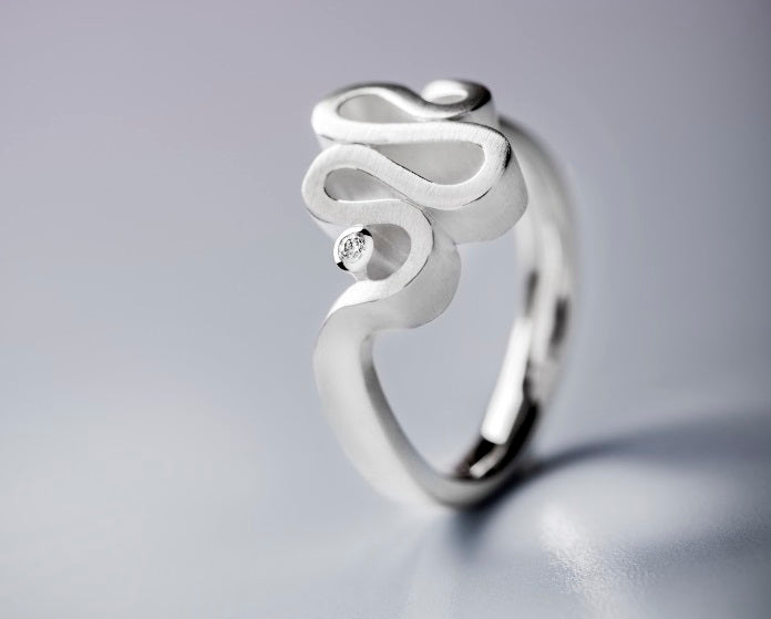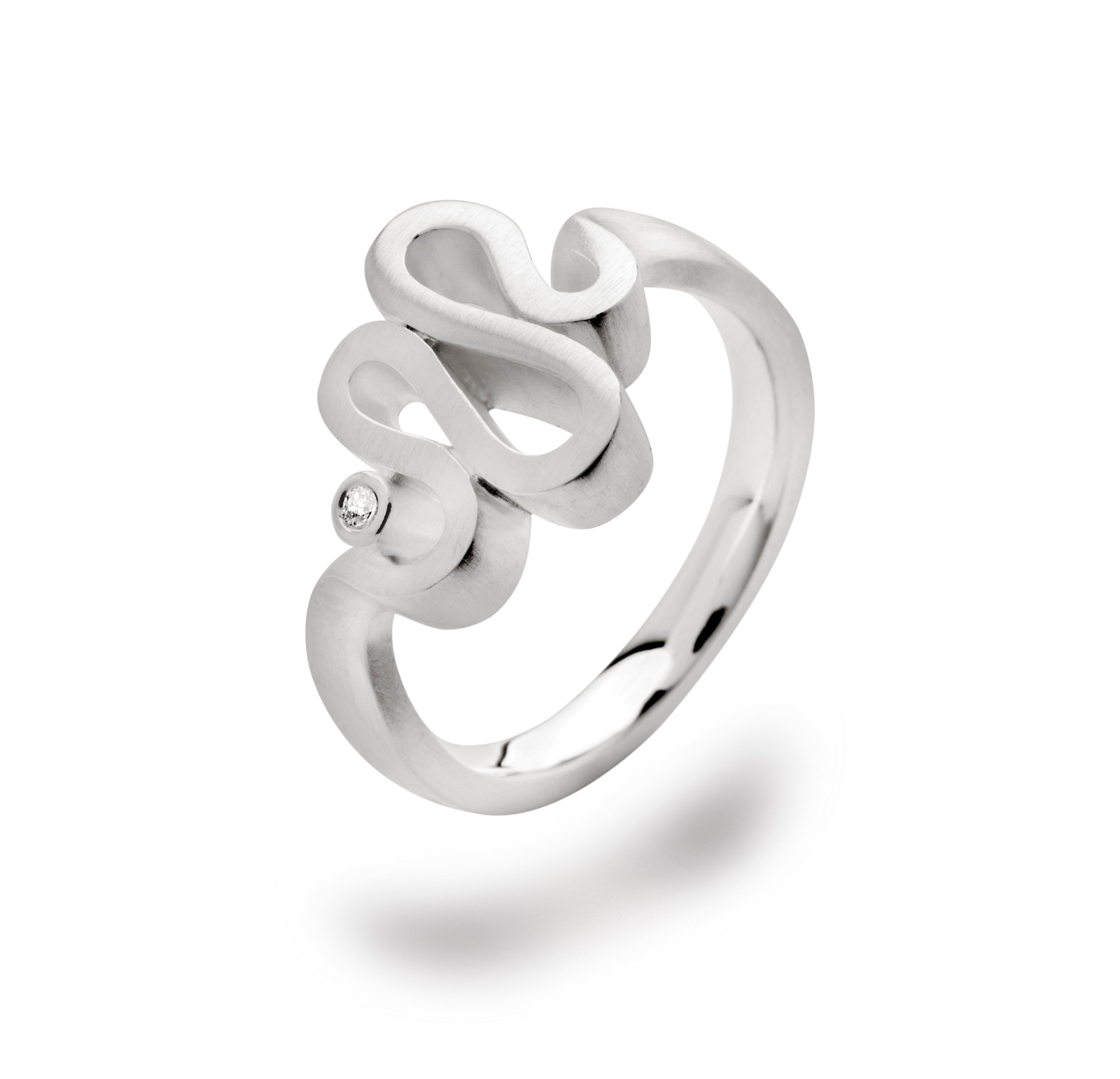 Denne kærligt håndlavede ring med en børstet mat finish, en fejende, dynamisk form og en funklende diamant (0,02 ct) vil give et frisk præg til ethvert smykkeskrin. Et moderne design af Catherine Niegel.