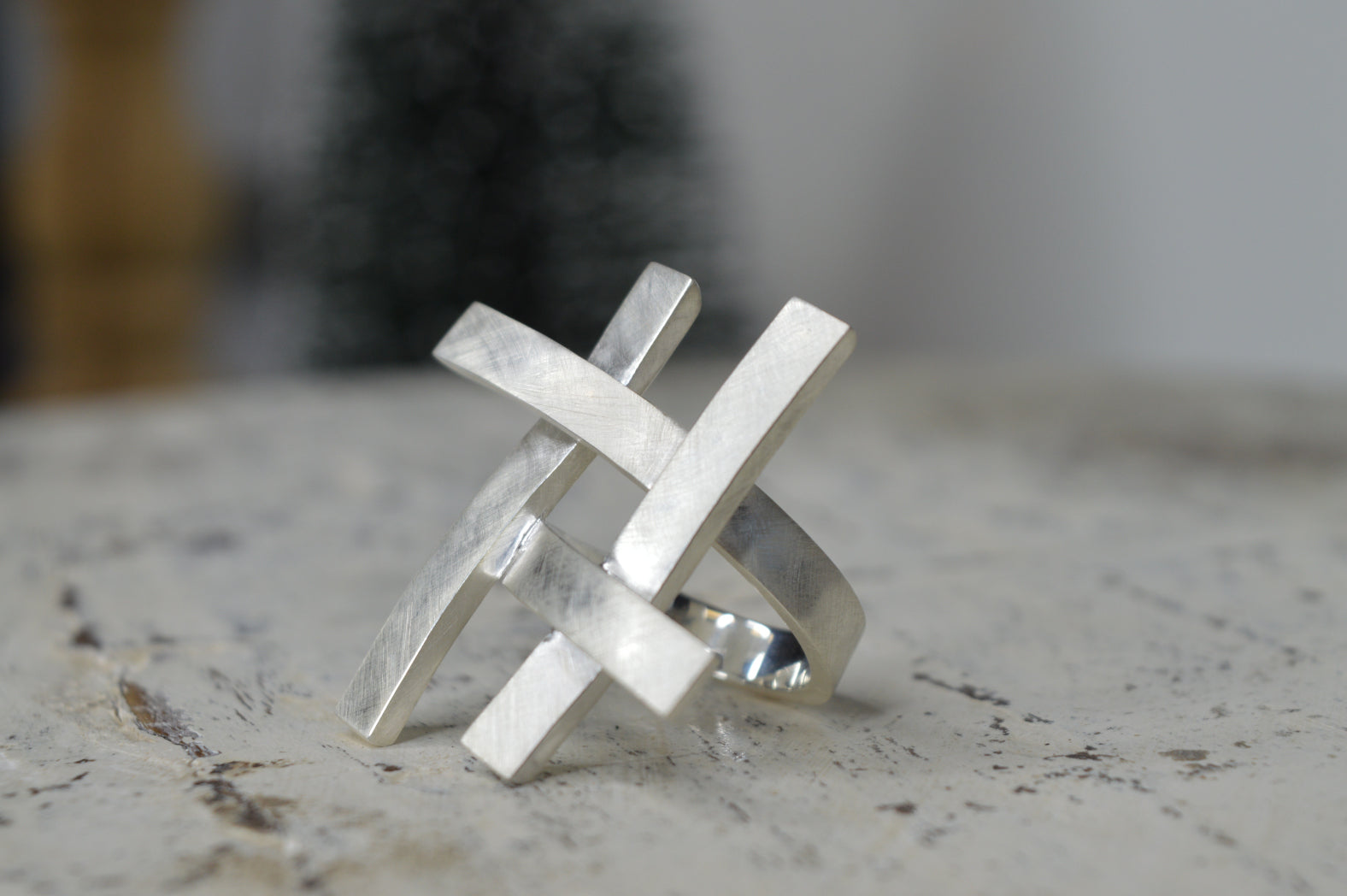 Denne ridsematte statement-ring (designet af Dan og Philipp Reiffert) lavet af individuelle, krydsende 925 sterlingsølvbarrer imponerer med sit høje, solide håndværk og moderne, men tidløse design. Det høje, solide håndværk, der er tydeligt her, løber også som en rød tråd gennem denne særlige designlinje fra Bastian Inverun. Fås med matchende vedhæng og øreringe.