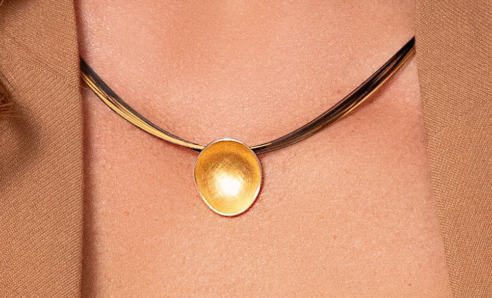'Golden Bowl Collection' - dette geometrisk formede vedhæng i forgyldt 925 sterlingsølv imponerer med sit tofarvede design kombineret med en ridsefast finish. Den ikke-cirkulære form og den indadgående krumning understreger vedhængets usædvanligt håndlavede karakter. Det skjulte ophæng på bagsiden giver også et særligt sporty, men elegant look til dette smykke, som er skabt af den Osnabrück-baserede designer Dietmar Sebastian. Fås med matchende øreringe og en matchende ring.