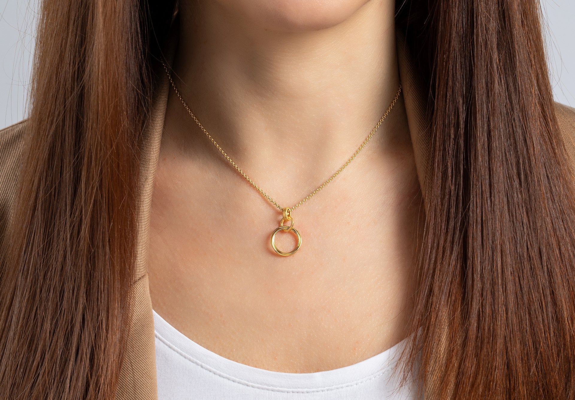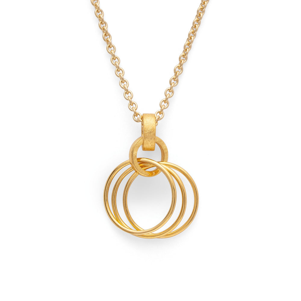 Et luftigt og let smykkedesign i forgyldt 925 sterlingsølv imponerer med fire sammenkoblede, cirkulære elementer. Dette moderne, men stilfulde vedhæng, designet af Antje Liebscher, imponerer med sin ridsematte og polerede overfladestruktur. Perfekt parret med de matchende øreringe.