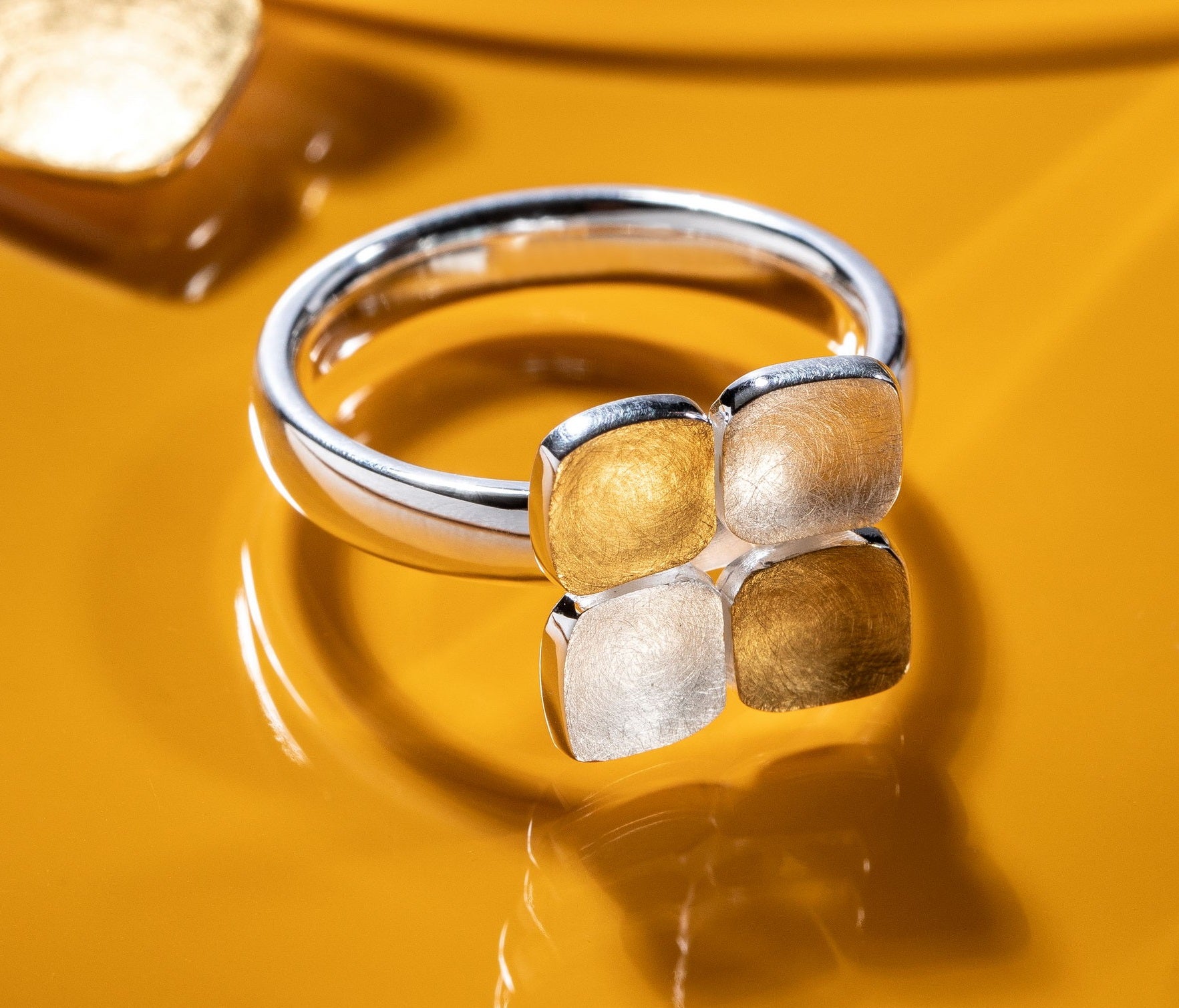 Tofarvet og konsekvent geometrisk inspireret. Denne ring, fremstillet af ridsematteret, delvist forgyldt 925 sterlingsølv med en poleret bånd, imponerer med sin klassiske form og varme forgyldning på to af de fire firkantede, diagonalt arrangerede dekorative elementer på ringhovedet. Kærligt designet af den Düsseldorf-baserede smykkedesigner Nadine Resch. Fås med matchende øreringe og et matchende vedhæng.