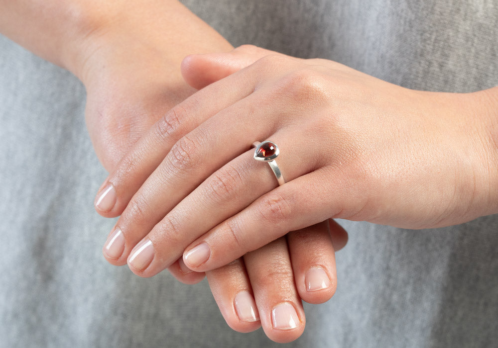 En ildrød granatsmykke med en vægt på 1,75 karat. Dens unikke udstråling og karakteristiske pæreformede cabochonslibning gør denne designerring, fremstillet af poleret og mat 925 sterlingsølv, til et sandt blikfang. Den passer perfekt sammen med de matchende øreringe og vedhæng.