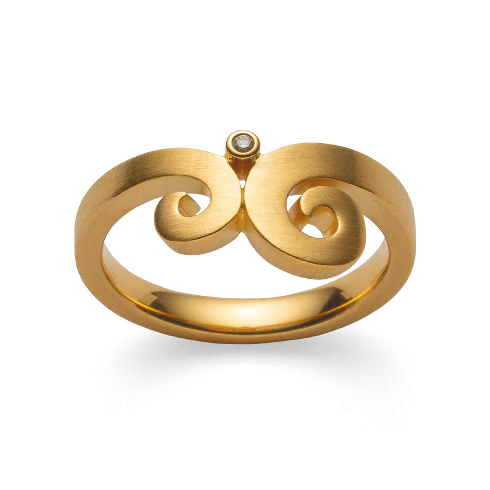 Delikat, sensuel og betagende smuk – denne forgyldte, men matte designerring er kronet af en funklende brillantslebet diamant (0,01 ct W-SI), hvilket gør den til et sandt blikfang til enhver lejlighed. Det romantiske og legende design af denne udsøgt håndlavede ring er skabt af designer Nadine Resch. Den passer perfekt til de matchende øreringe og vedhæng.