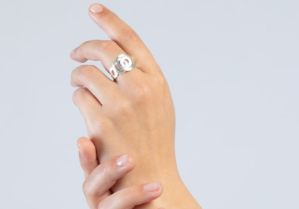 Sammenflettede cirkler møder et attraktivt samspil af forskellige overfladeteksturer. Denne udtryksfulde ring lavet af børstet og ridsematteret 925 sterlingsølv imponerer med sit markante ringhoved og geometrisk inspirerede design. Designeren Nadine Resch fra Düsseldorf har skabt dette sporty, men elegante designersmykke, der passer perfekt til de matchende øreringe.