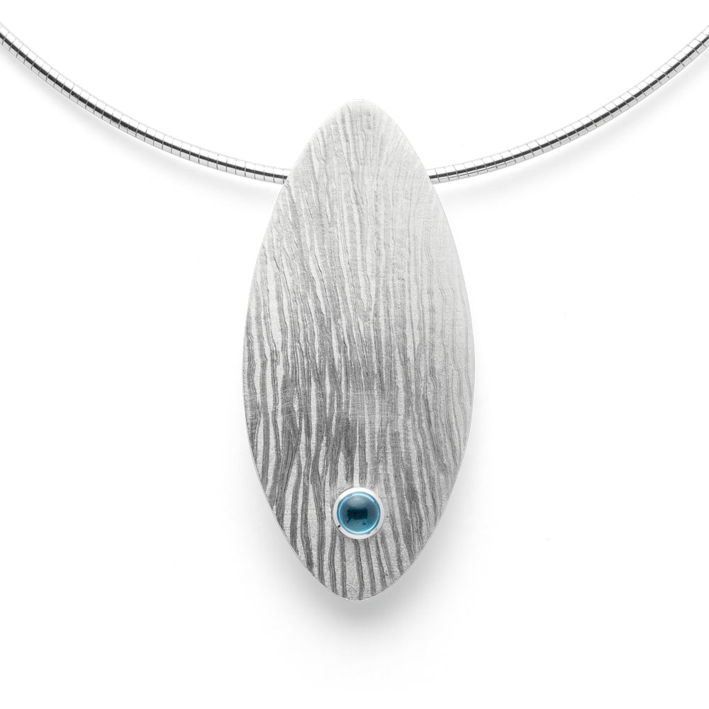 Navetteförmiger großer Anhänger aus 925/- Sterlingsilber mit besonders gearbeiteter Oberflächenstruktur und einem an der Unterseite positionierten Blautopas im Cabochonschliff mit 0,83ct. Durch die besonders handwerkliche Optik wird dieser opulente Halsschmuck aus der Feder des renommierten deutschen Designers Dietmar Sebastian zu einem waschechten Schmuckhingucker, an dem man lange Freude haben wird. Die rückseitig angebrachte Aufhängung sorgt für die besonders hochwertige und elegante Ausstrahlung dieses ausdrucksstarken Designschmuckstücks. Perfekt in Kombination mit den passenden Ohrsteckern.