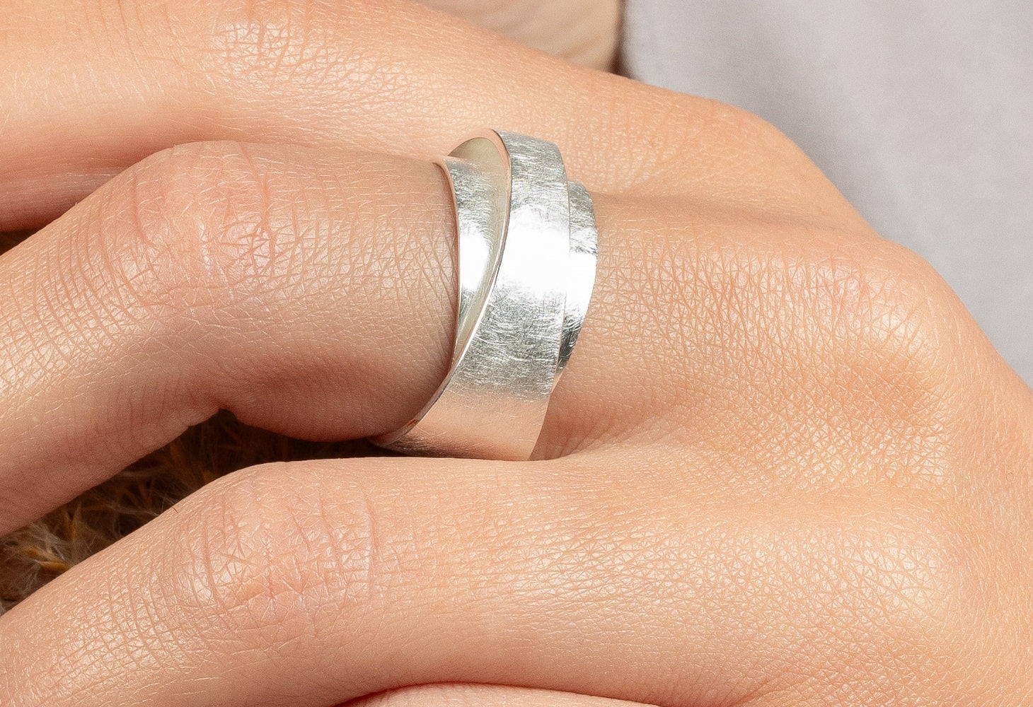 Designstarker Ring aus kratzmattiertem 925/- Sterlingsilber. Der zauberhafte Ring überzeugt mit einer einzigartigen Wickeloptik und einer charakterstarken Oberflächenbearbeitung. Ein wertig gearbeitetes Designschmuckstück mit Unikatcharakter, welches für die Ewigkeit geschaffen ist (Design von Nadine Resch).