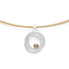 Ein zauberhafter Designanhänger aus sandmattiertem und poliertem 925/- Sterlingsilber besticht durch drei übereinandergelegte Schmuckelemente in attraktiver Ringoptik. Der funkelnde Brillant mit 0,02ct, umrahmt von einer goldbelöteten* (14K) Fassung, lässt den Anhänger zu einem besonderen und stilvollen Schmuckstatement werden. Ein einzigartiges Design aus der Feder der Düsseldorfer Designerin Nadine Resch. Zusammen mit den passenden Ohrsteckern und dem passenden Ring ist dieser Designanhänger vielfältig kombinierbar.