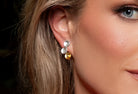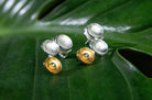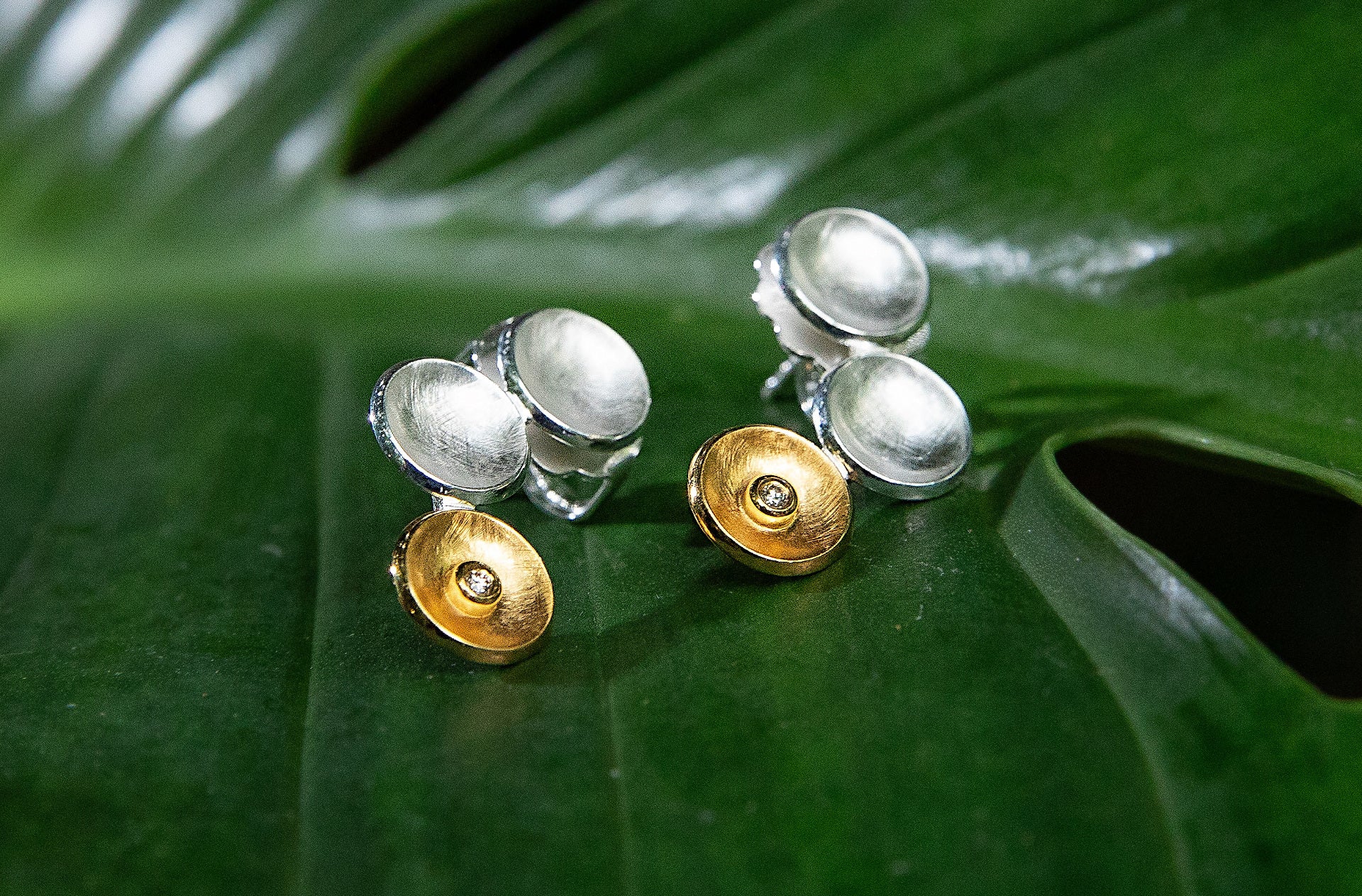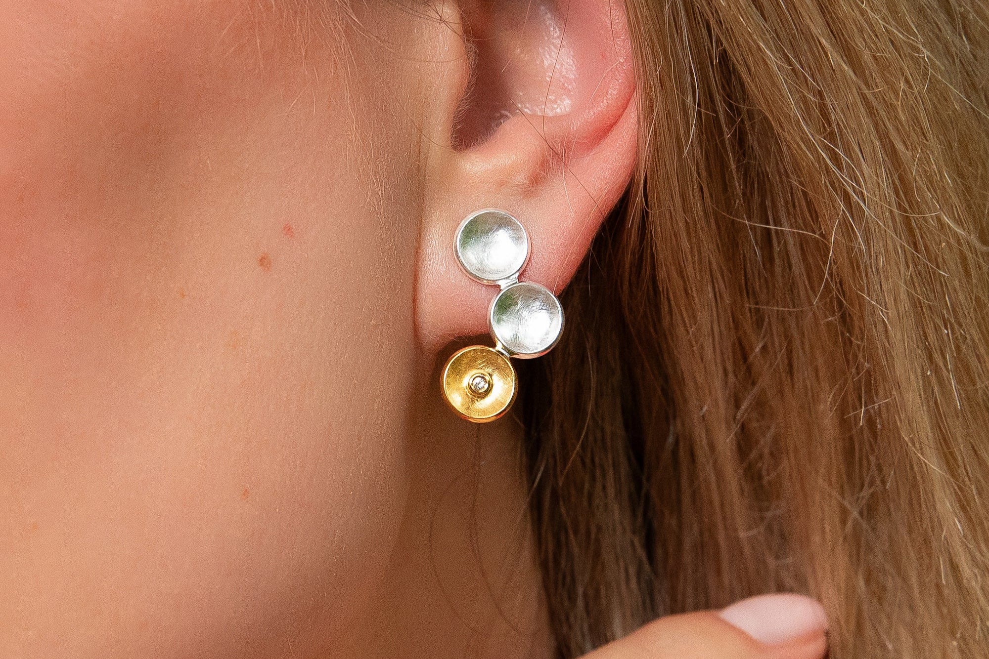 Drei aneinander gereihte, schalenförmige Schmuckelemente, die durch einen funkelnden Brillanten (0,02ct) sowie die bicolore Farbgebung gekrönt werden, ergeben diesen zeitlosen und modernen Ohrstecker (Design by Nadine Resch). Perfekt in Ergänzung mit dem passenden Anhänger und Ring.